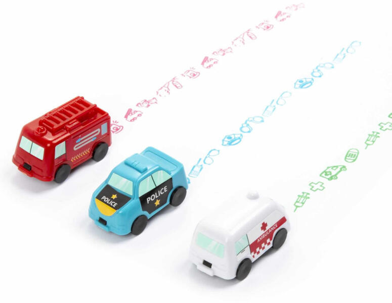 3 db jármű: tűzoltóautó, rendőrautó és mentőautó. Ahogy gurítjuk a kisautókat, a témához kapcsolódó nyomokat hagy. Nagyon jó szórakozás!