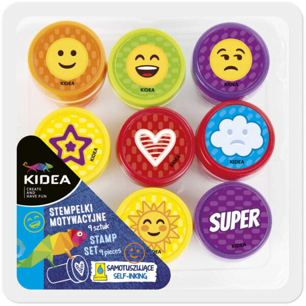 Nyomda szett, 9 db-os, motivációs, önfestékező, Kidea. A készlet 9 különböző mintájú és színű bélyeget tartalmaz. A különböző nyomdák segítenek különböző érzelmeket kifejezni. Kiválóan alkalmasak a gyerekek munkájának értékelésére, motiválására, hangulatnapló vezetésére is. Csomagolás mérete: 10x10x3,7cm.