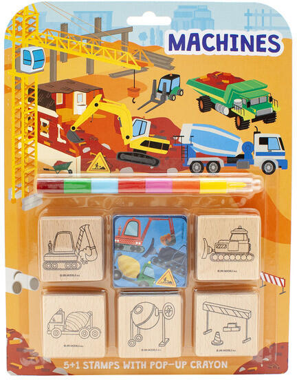 Munkagépek témájú bélyegző készlet 5 darab fanyomdával és színes nyomdapárnával. Kreatív játék, amely fejleszti a gyerekek képzelőerejét és finommotorikus készségeit. Ideális kisfiúk számára 3 éves kortól.